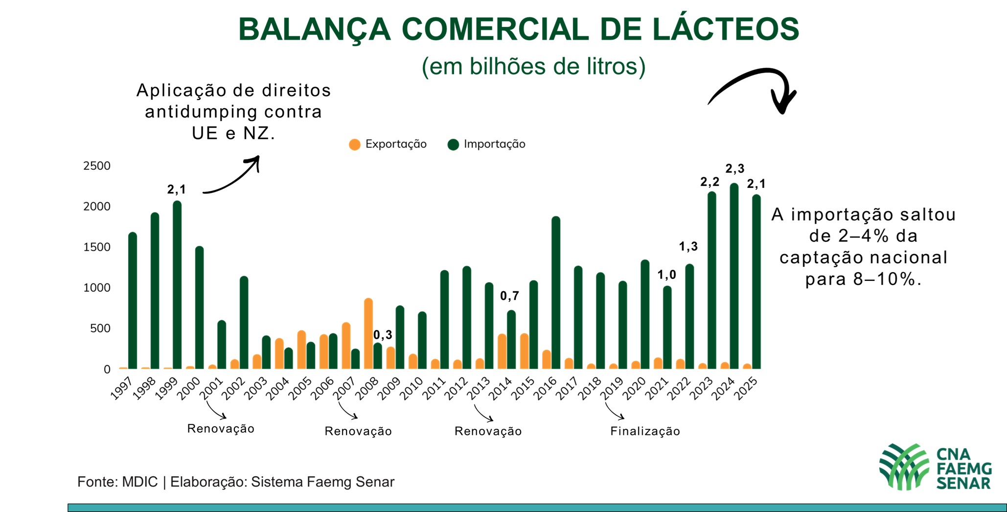 O histórico da balança comercial de lácteos mostra que o Brasil é, tradicionalmente, um importador desses produtos, com volumes de importação superiores às exportações na maior parte das últimas décadas. Entre o fim dos anos 1990 e os anos 2000, o país registrou déficits acentuados, impulsionados pela entrada de leite em pó principalmente proveniente da União Europeia e Nova Zelândia.