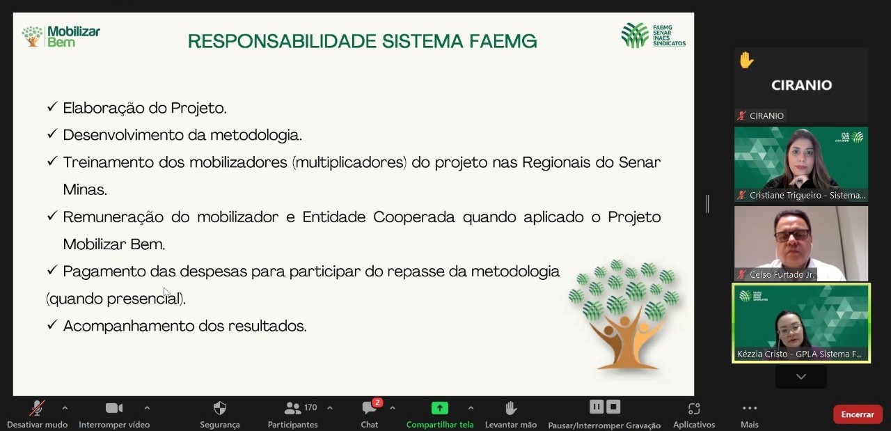 O Projeto Mobilizar Bem reuniu mais de 170 pessoas em sua última live para tirar dúvidas dos participantes. O “Intensivão Mobilizar Bem” é mais uma ação rumo ao objetivo do projeto do Sistema FAEMG para melhor qualificar a demanda do mercado de trabalho e as necessidades das comunidades rurais, por meio do processo de mobilização. Junto a isso, a ideia é aprimorar a gestão das entidades cooperadas e parceiras na realização dos eventos do Sistema FAEMG no interior.
