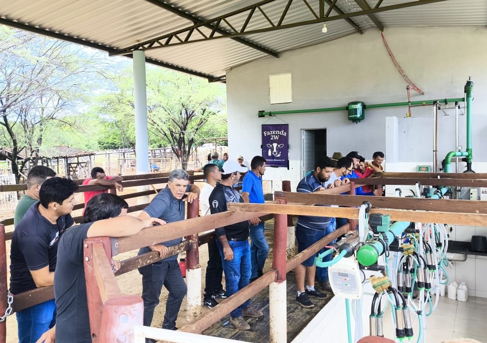 As duas primeiras turmas de 2026 já passaram pela propriedade, a Fazenda 2W, em fevereiro. Mais de 20 produtores, que estão inseridos em novos grupos de ATeG, conheceram a estrutura do local. Por algumas horas, o produtor Wemerson Ramon tornou-se instrutor, mostrando o que foi feito na fazenda e os resultados alcançados. O foco da visita foi apresentar o sistema de pastejo rotacionado, as instalações de ordenha, o manejo de pasto e o uso de cana como suplementação alimentar para o período de seca.