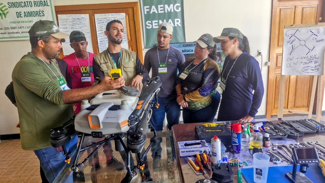 Diante de um agro cada vez tecnológico, o Sistema Faemg Senar, em parceria com o Sindicato dos Produtores Rurais de Aimorés, realizou o curso piloto de Operador de Aeronaves Não Tripuladas – Drone (Asa Rotativa) – Manutenção Básica de Drone Agrícola, marcando uma nova etapa na qualificação dos produtores rurais do Leste de Minas. A capacitação ocorreu no Córrego Natividade, na Fazenda Brumado, na última semana, e reforça o contínuo investimento do Sistema em inovação e modernização.